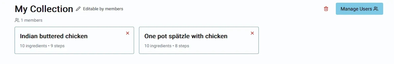 Create collections of recipes and invite others to share your favorite dishes. Perfect for couples, friends, or families.