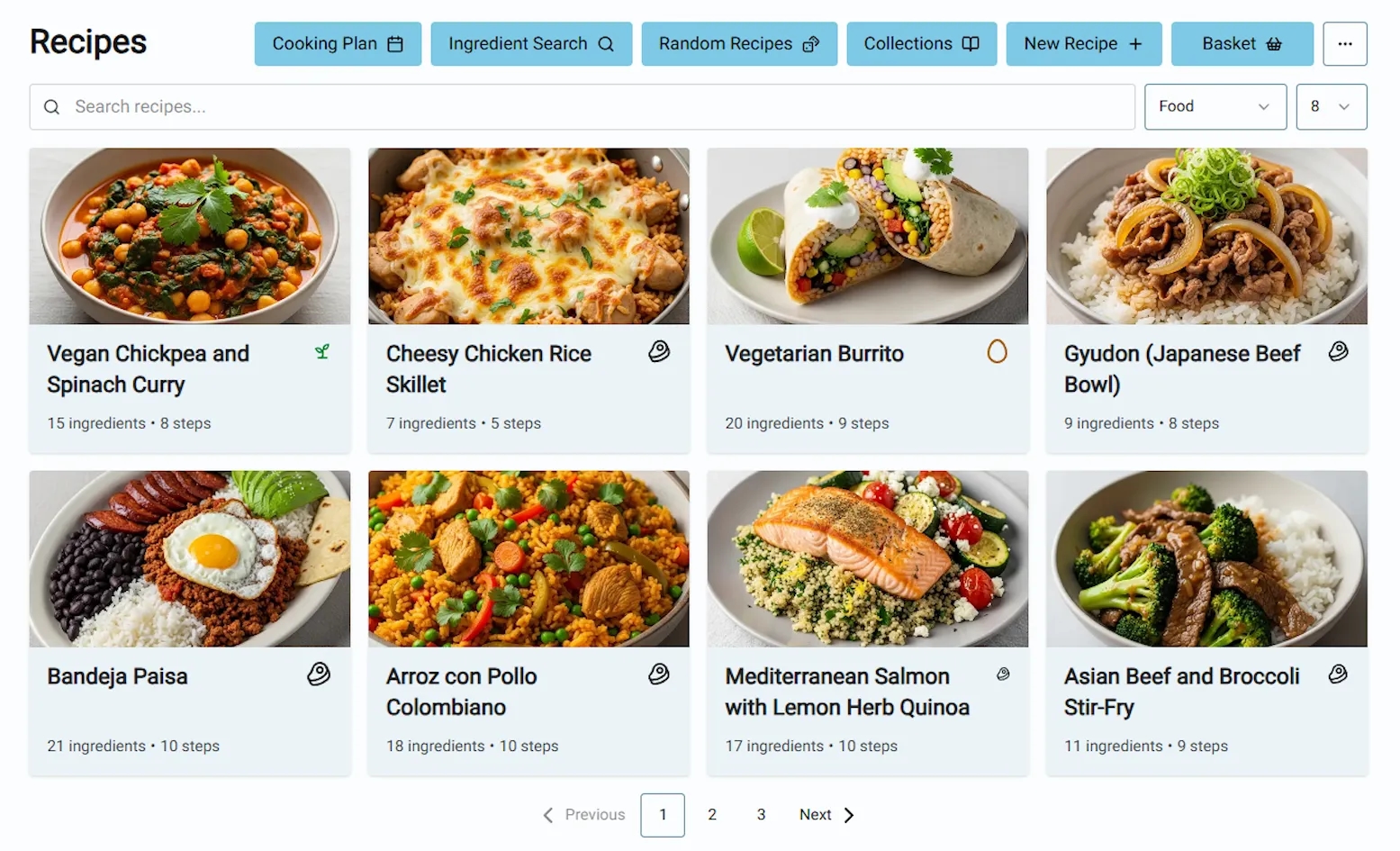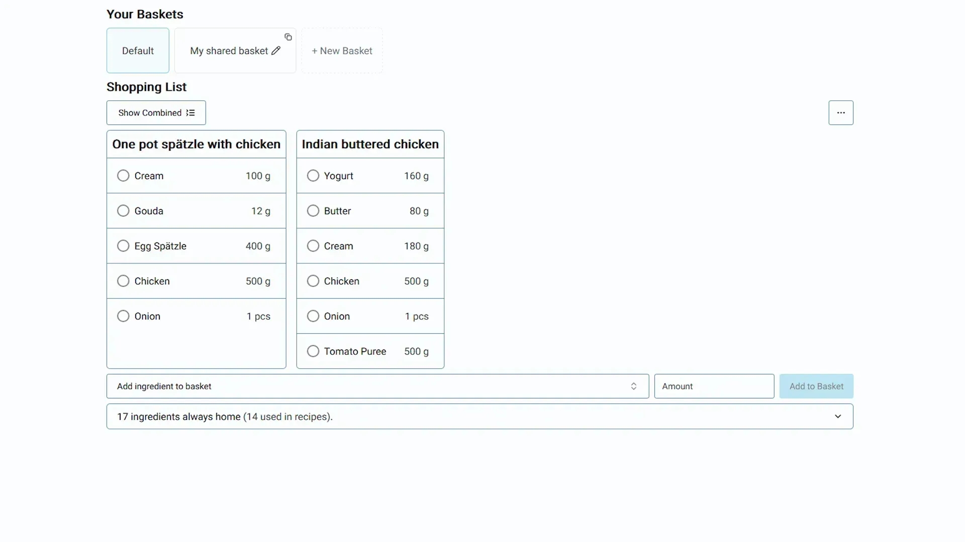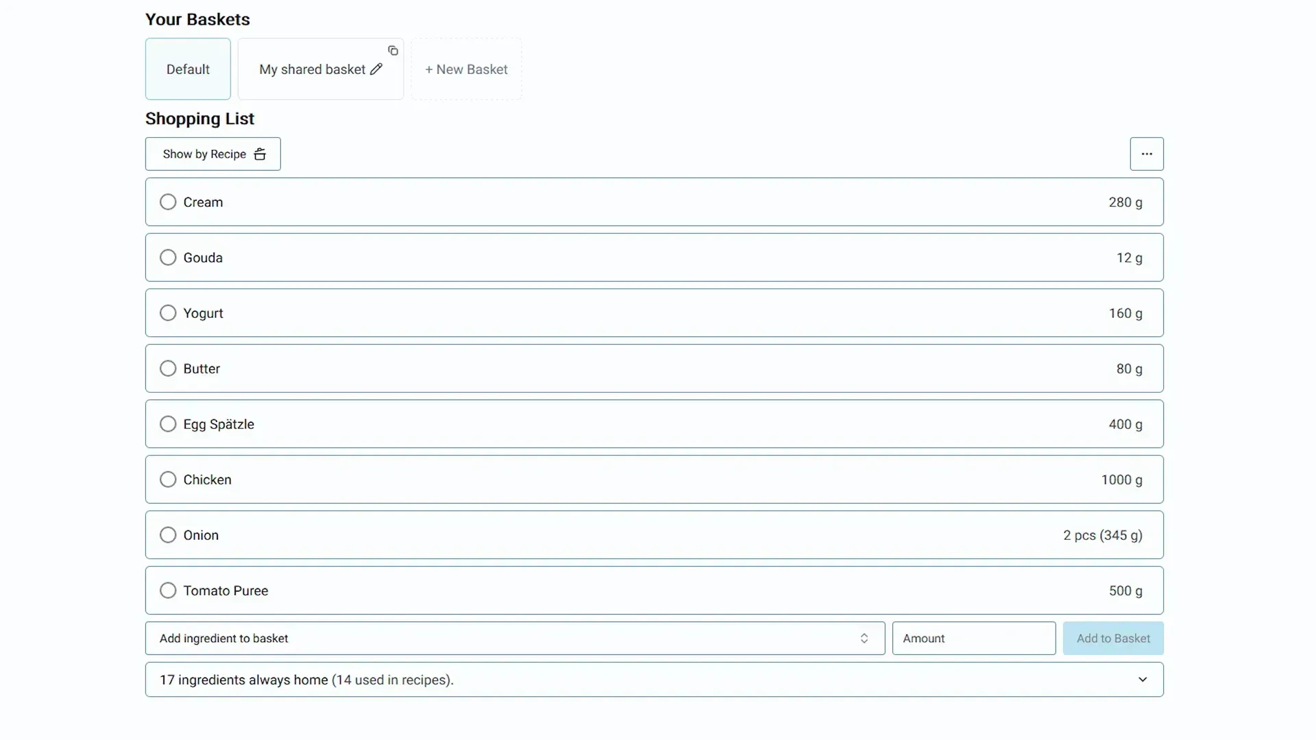 Add recipes to your shopping basket, filtered by what you already have at home, and share baskets with friends and family.