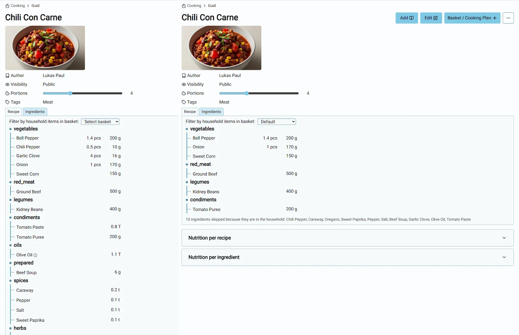 Compact overview of ingredients and option to only show ingredients that you don't have already at home.